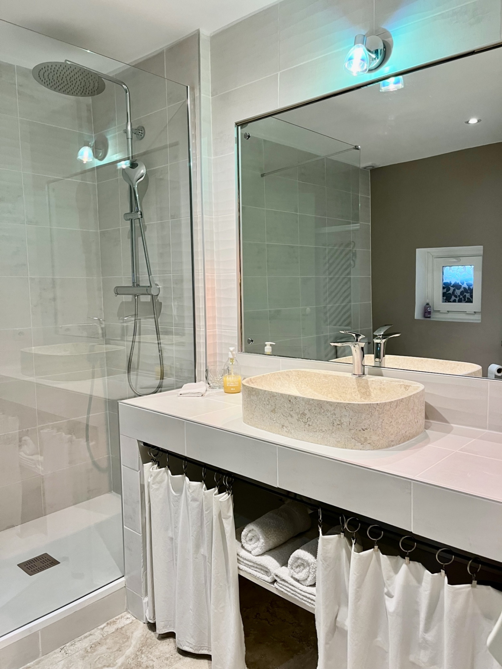 La partie privative est elle composée d'un grand salon et de 3 chambres dont 2 avec salle de bains.