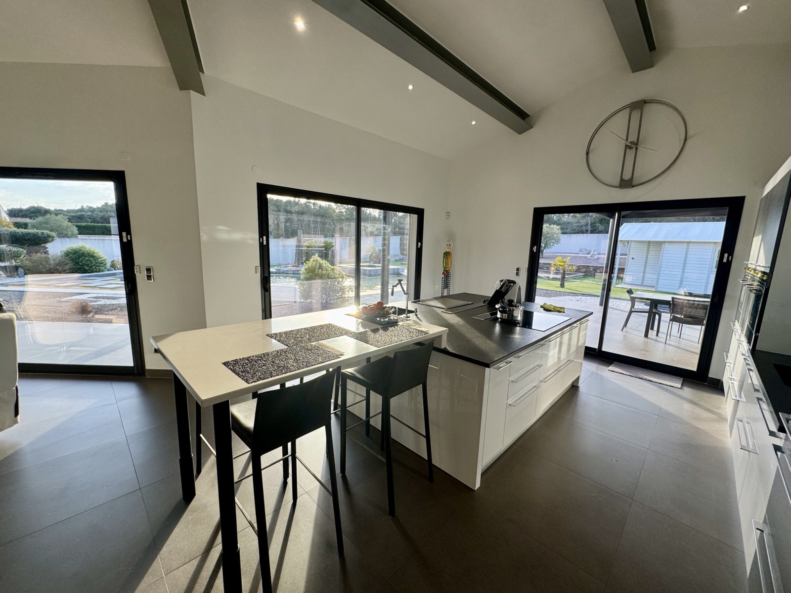 L’intérieur, pensé pour le confort et la praticité, propose une vaste pièce de vie baignée de lumière grâce à de grandes baies vitrées ouvrant sur le jardin. La cuisine contemporaine, équipée d’un plan de travail en quartz et d’un système de double hotte discrète, ravira les amateurs de gastronomie. Un cellier et une buanderie avec accès direct au jardin complètent l’ensemble.