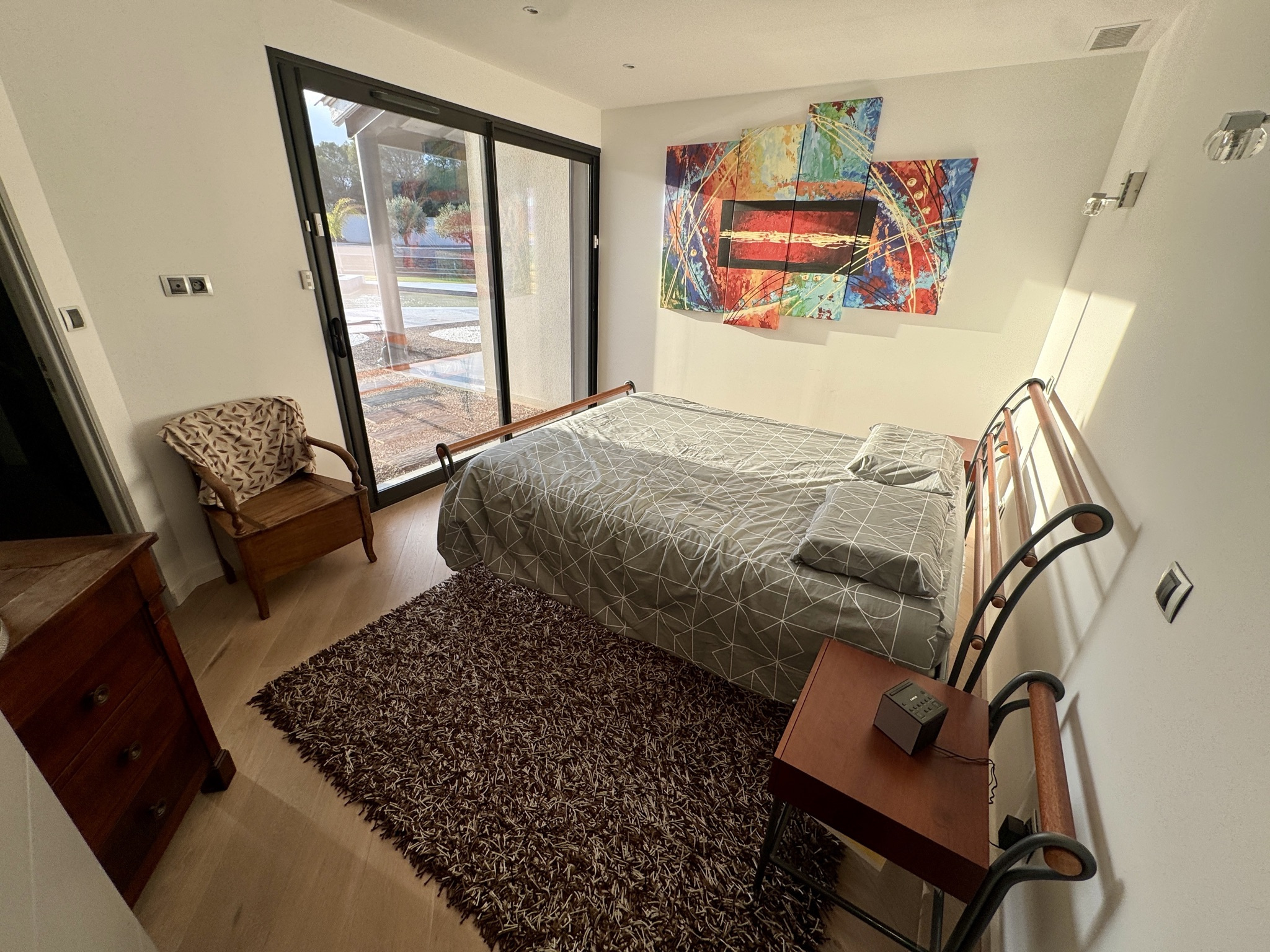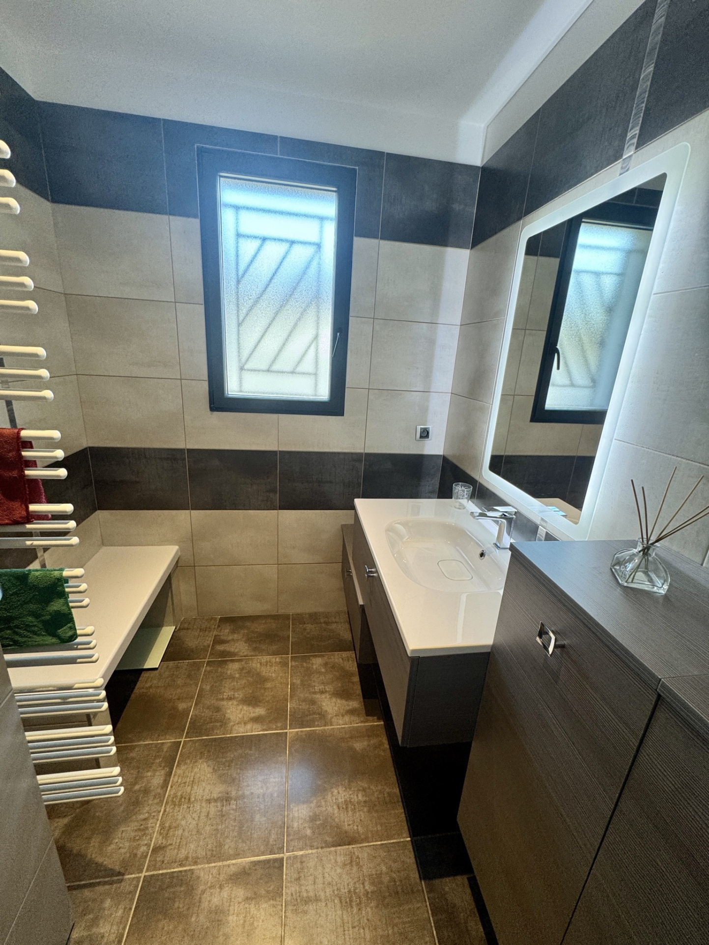 La maison dispose de deux chambres, chacune avec terrasse et pergola, ainsi qu’une suite parentale avec dressing, salle d’eau raffinée et WC séparé. Un WC invité avec lave-mains et fenêtre vient parfaire l’agencement.